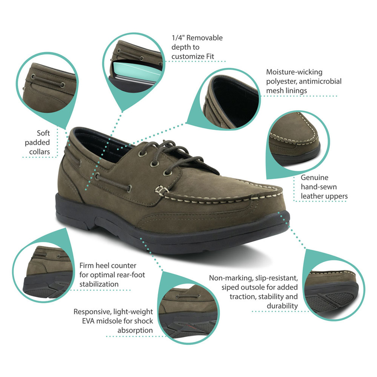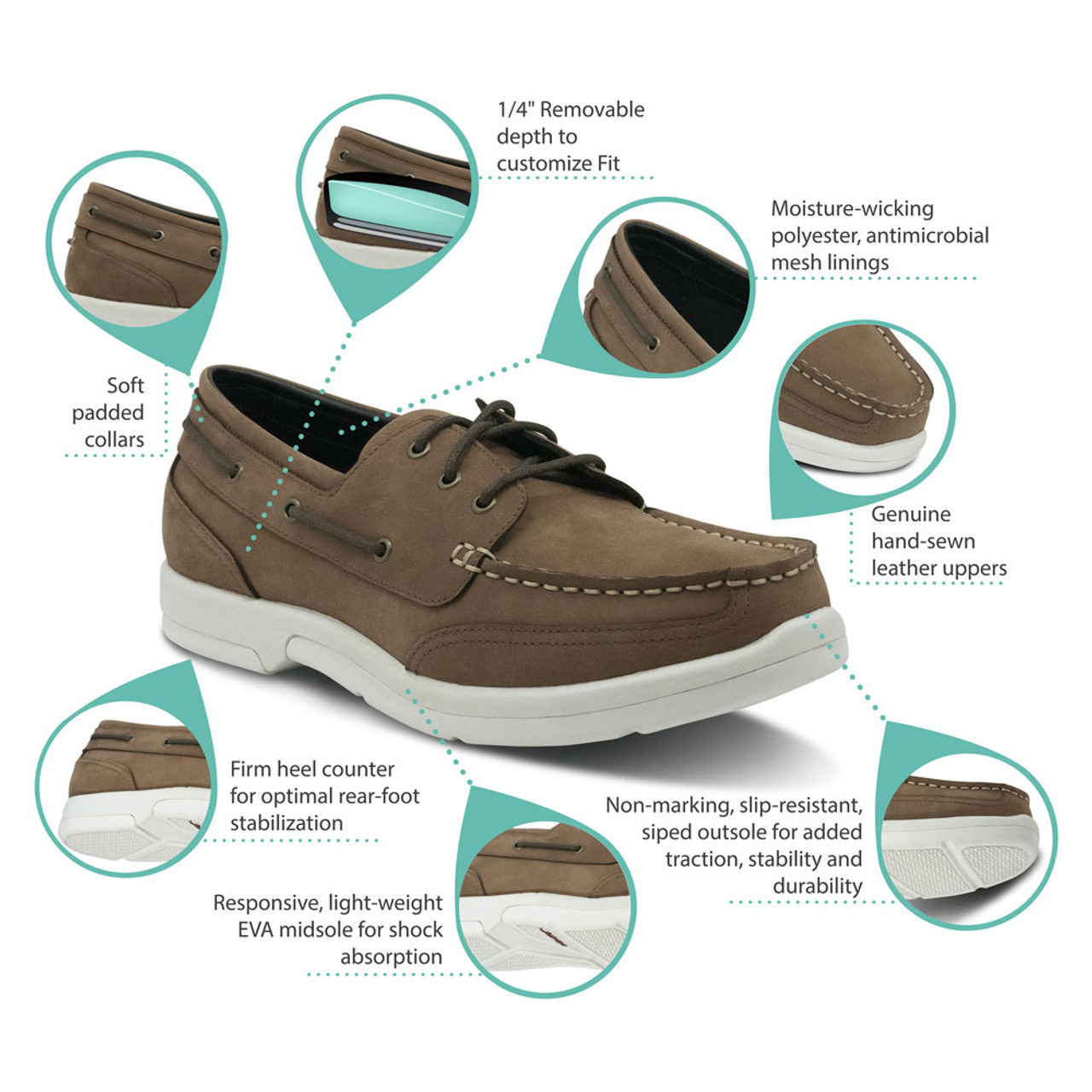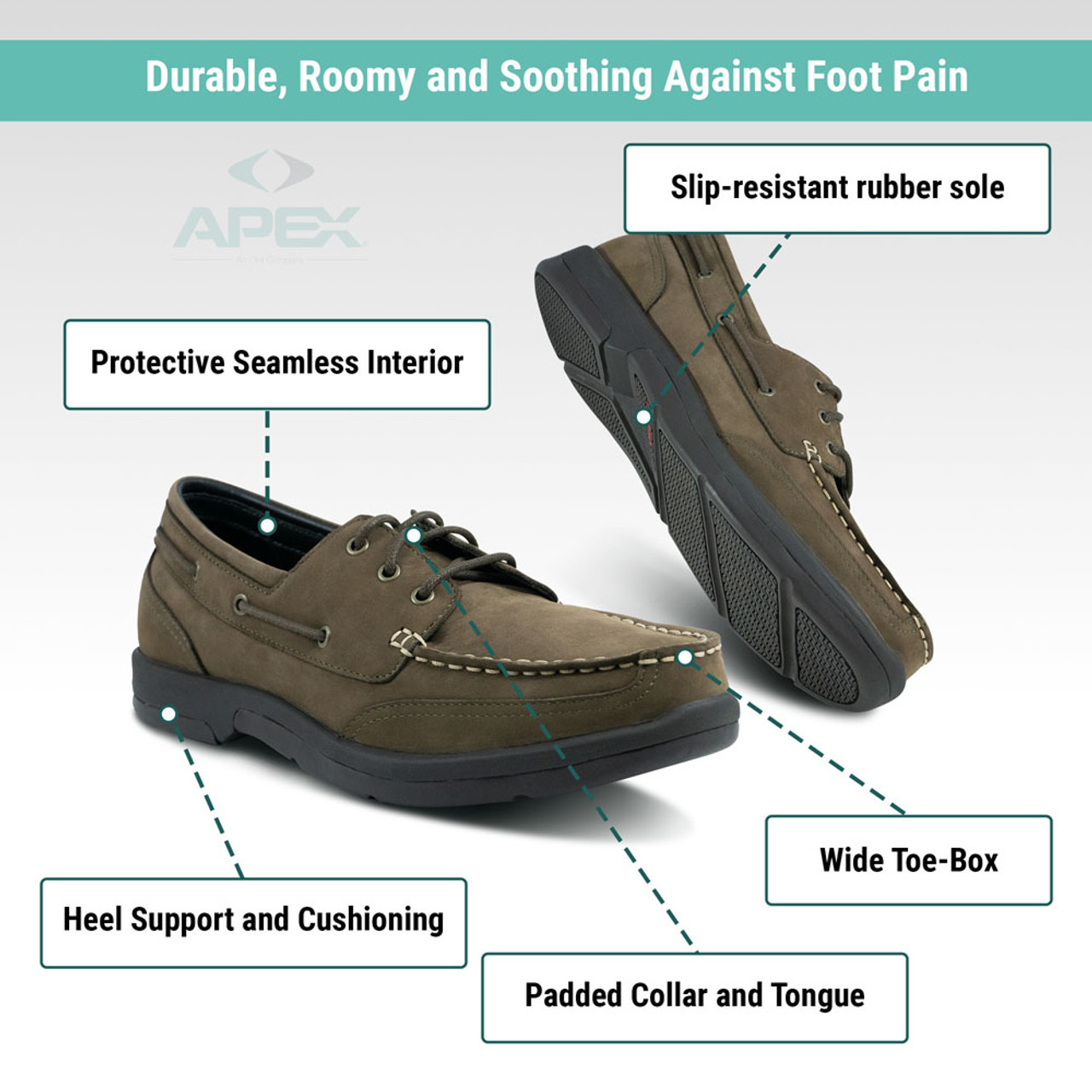 Improving upon a timeless classic, the Apex® Men's Orthopedic Boat Shoe brings this footwear category into the 21st century with the infusion of innovative materials, the latest foot health technologies, and customizable features. Capable of dressing up a pair of jeans or adding a dash of style to business attire, these shoes don’t just look good – they feel good, too. A comfy, lightweight EVA midsole absorbs shock to keep feet pain free, while a firm heel counter and slip resistant outsole, which exceeds SATRA and Mark II standards, provides stability. Handsome nubuck leather with hand-sewn stitching adds durability and style, while moisture-wicking mesh liners ensure feet stay cool and dry. Finally, an added removable depth insert allows for a truly customized fit, along with the ability to accommodate orthotic inserts.