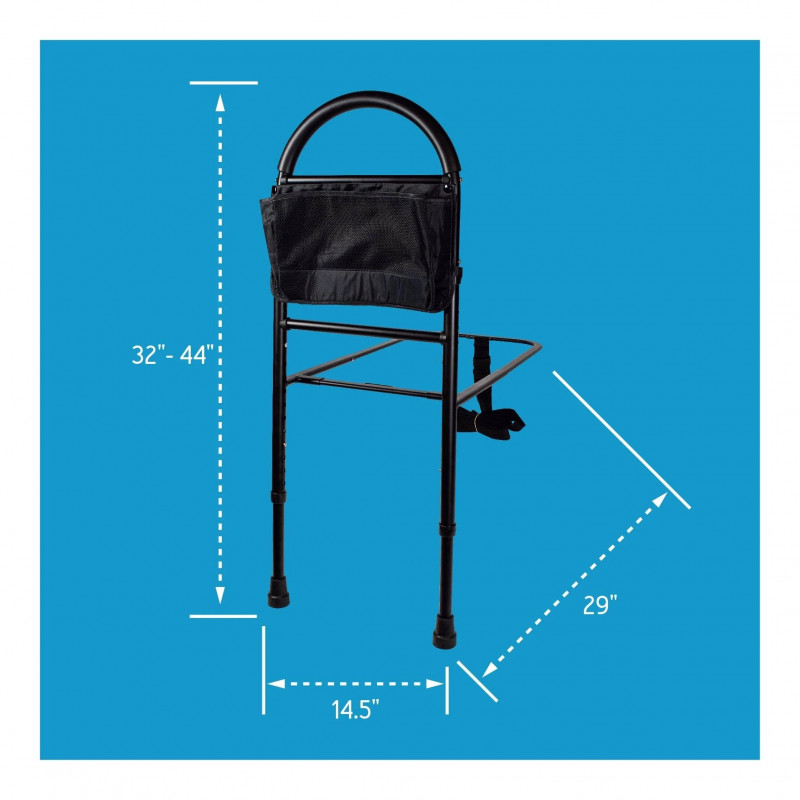 The Bedside Rail is designed to allow the user to get in and out of bed safely and comfortably. This rail is tool-free, quick, convenient, and easy to assemble. Place the rail under the bed frame and adjust to fit. The bed rail for adults adjusts from 32" to 44" in height with legs reaching all the way to the floor for added support. The bed assist rail includes foam grip for comfort, underbed rail strap for added safety, and removable mesh pouch.