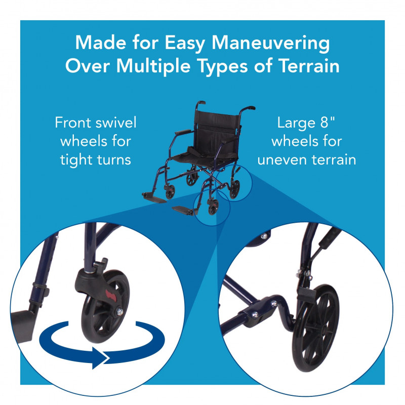 - 8" wheels provide smooth gliding and easy maneuvering. The foldable lightweight transport chair offers easy moving with oversized wheels. Perfect for numerous terrains. It can turn tight, ideal for confined spaces such as hallways.