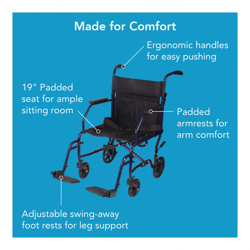 - Large 19" seating provides luxurious comfort. Comfort is critical with any mobility aid. The lightweight transport chair sports a comfortable 19" seat with plenty of room.