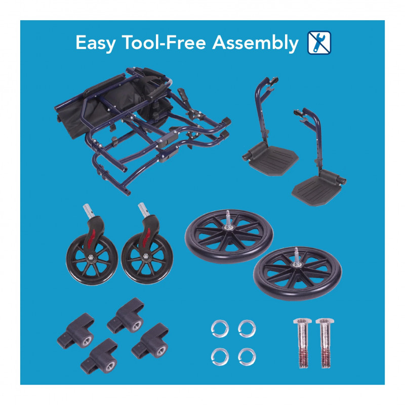 Stay mobile on all terrains with the Carex Classics Transport Chair. This transport chair features oversized 8" wheels for easy maneuverability and a smooth glide. The swing-away footrests and folding features allow for compact storage and transportation—an excellent choice for safe, sturdy, and comfortable portability. No assembly required.