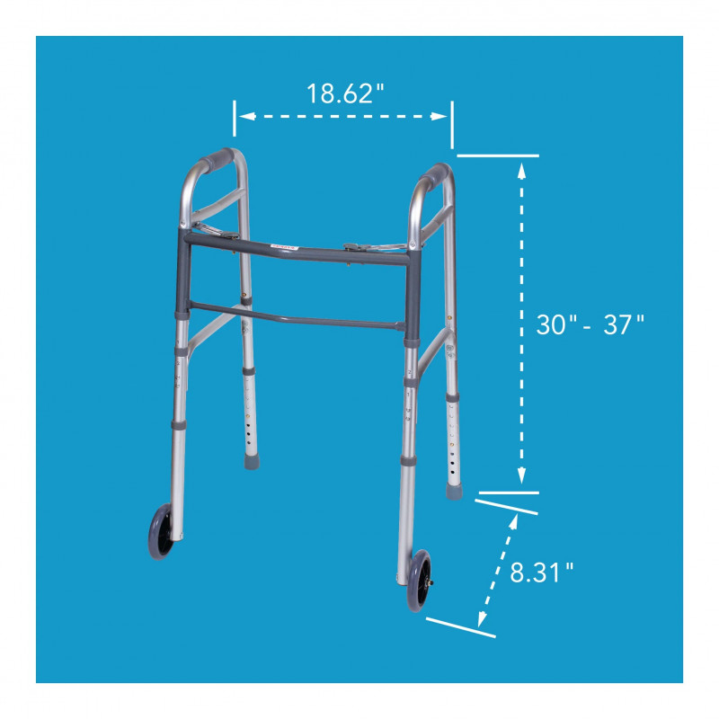 Stay mobile, active, and able with the Carex Folding Walker. The two-wheel walker offers a dependable source of support and assistance while walking. It is height adjustable from 30" to 37" for comfort and safety. Adjusting the portable walker is comfortable with marked peg holes for convenience. Take the compact walker anywhere by folding it for easy transport. Its sides are detachable for storing in tight spaces.