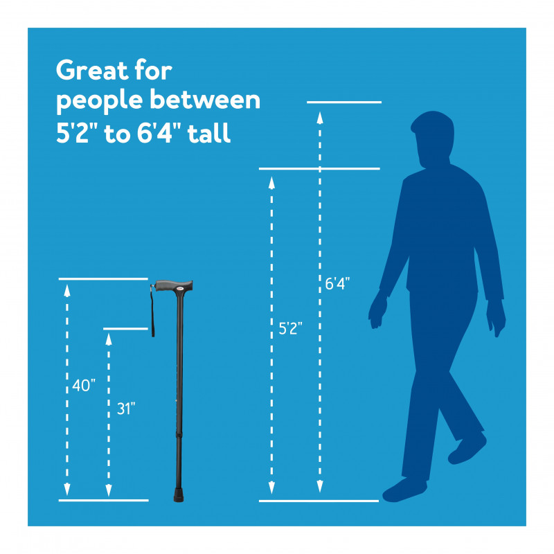 - Height adjustable with the push of a button. This mobility aid's height can be adjusted from 31" to 40" to suit heights of 5'2" to 6'4".