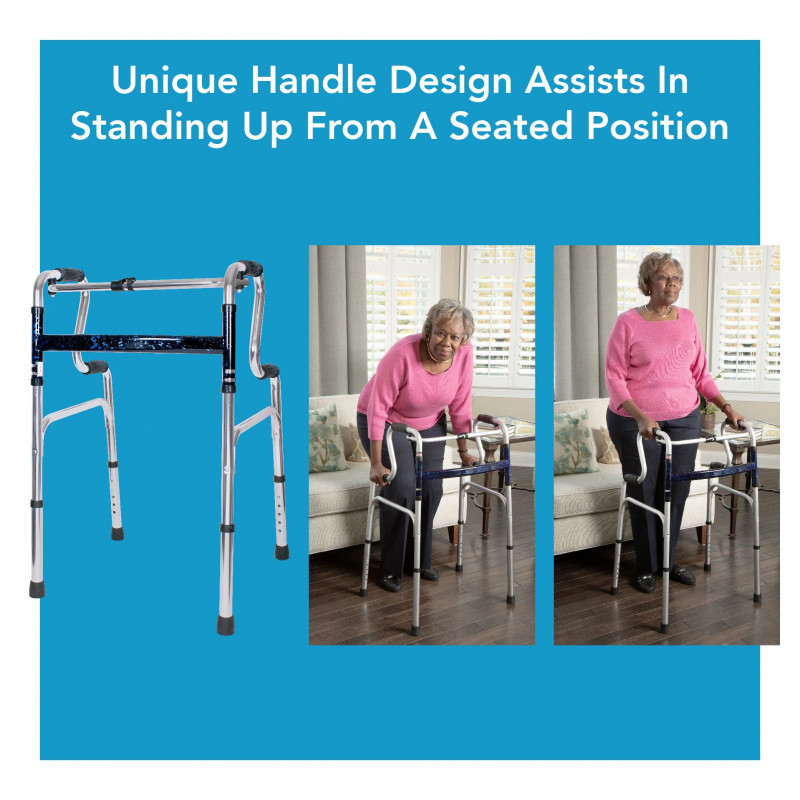 Get help sitting, standing, and walking with the Carex Uplift Walker. The walker for adults is height adjustable from 30" to 37" for various heights. An easy single-button design allows the lightweight walker to fold for easy transport and storage. Its matte silver finish with a blue crossbar adds a sense of flare.