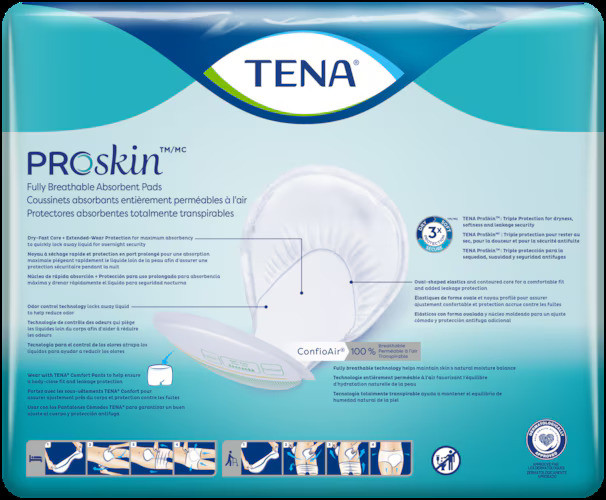 TENA ProSkin Night Super Fully Breathable Absorbent Pads are specially designed for overnight use and high absorbency needs. These extra-long, bowl-shaped pads contour closely to the body, providing reliable leakage protection and a secure, comfortable fit. Featuring ConfioAir 100% Breathable Technology, these pads help maintain the skin’s natural moisture balance, promoting skin health and comfort. They are best used with TENA ProSkin Comfort Pants and are easy to apply whether standing or lying down.