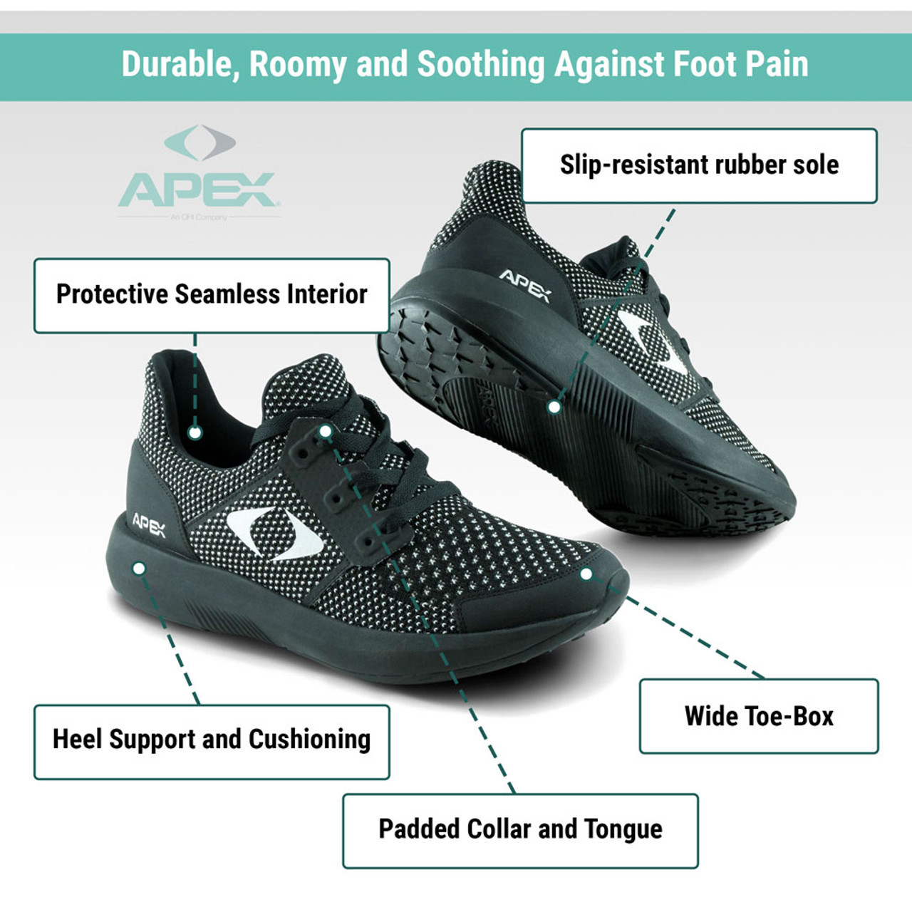 Look & Feel Great With Every Step - The Apex Performance Athletic Sneaker, the newest addition to the Apex Active Collection, is equally comfortable and stylish. The traction-orientated, lightweight design makes it perfect for day-to-day wear; the breathable, open mesh upper supports cooling and moisture transfer and the rigid heel counter helps to keep your heel centered and stable.