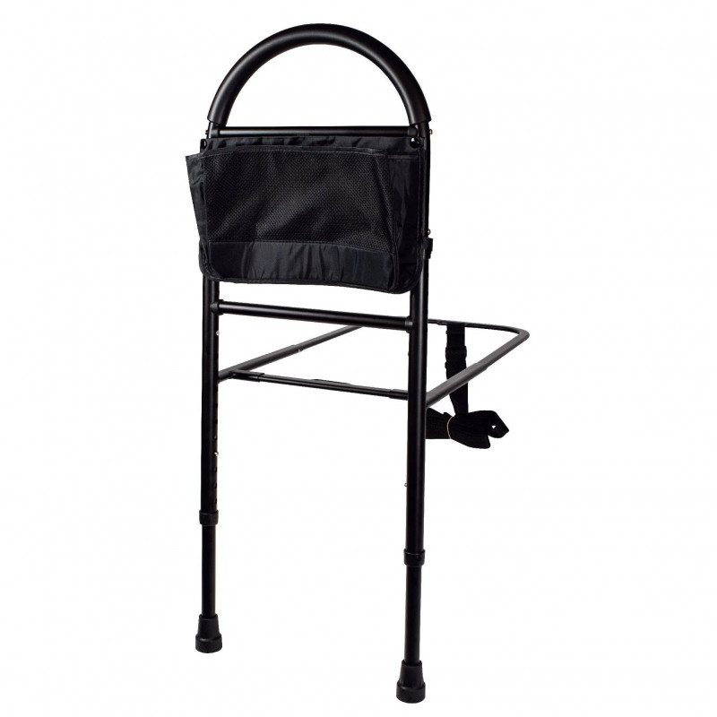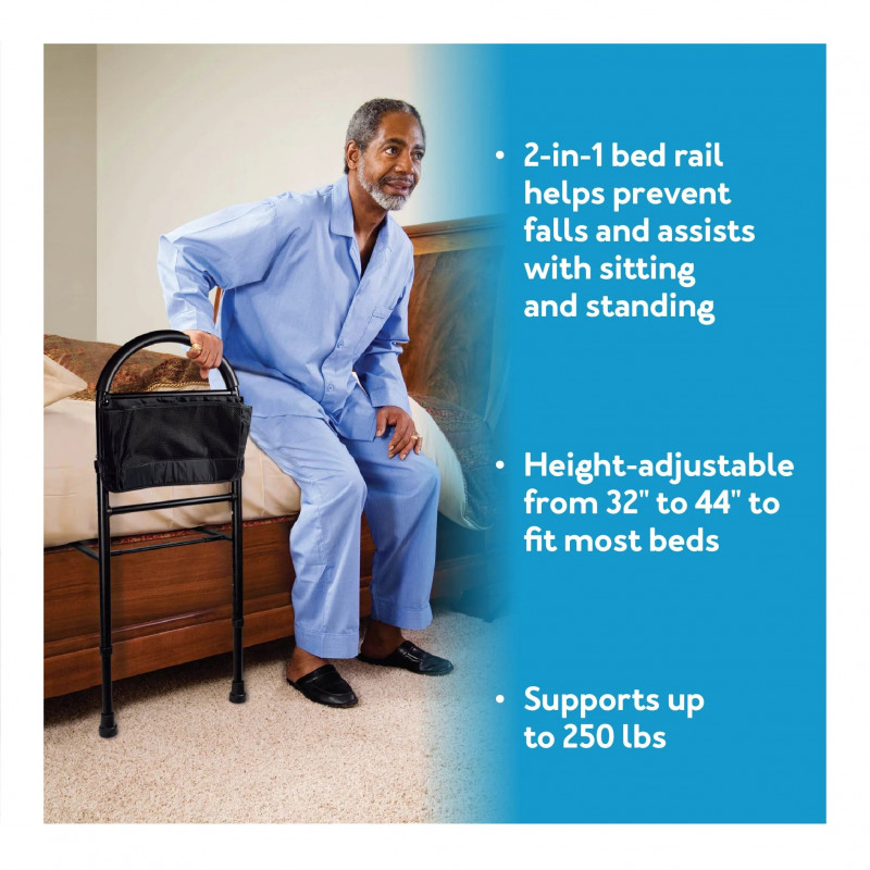 The Bedside Rail is designed to allow the user to get in and out of bed safely and comfortably. This rail is tool-free, quick, convenient, and easy to assemble. Place the rail under the bed frame and adjust to fit. The bed rail for adults adjusts from 32" to 44" in height with legs reaching all the way to the floor for added support. The bed assist rail includes foam grip for comfort, underbed rail strap for added safety, and removable mesh pouch.
