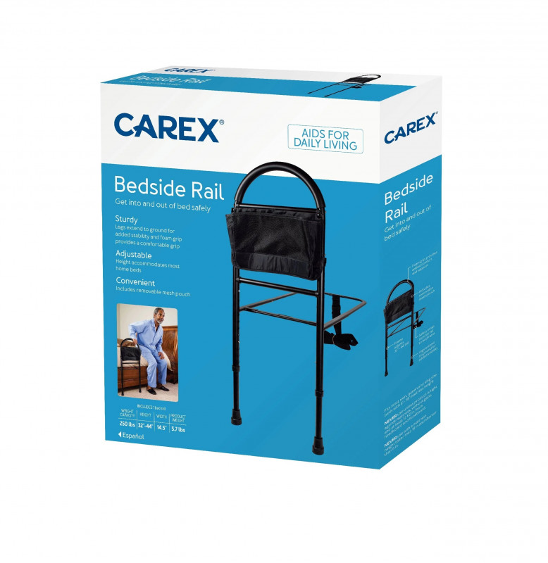 - Adjustable to fit most beds. The bed safety rail is height adjustable from 32" to 44". It fits twin, full, queen, and king-sized beds on both sides. The Carex Bed Rail features a safety strap that loops around the rail, connecting to the bed frame.