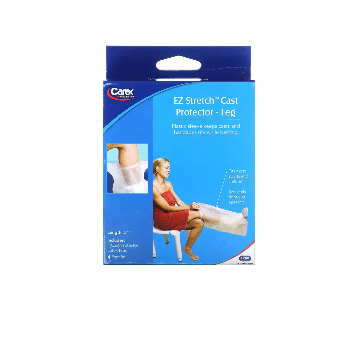 Keep your cast protected while showering. The E-Z Stretch Leg Cast Protector for showering is made from durable, reusable, and latex-free material. It stretches easily over the cast and then self-seals tightly around the leg without straps or tape. This waterproof cast protector will not puncture or rip easily, and it can be put one with one hand. The cast and wound protector is designed to fit most adults and children.