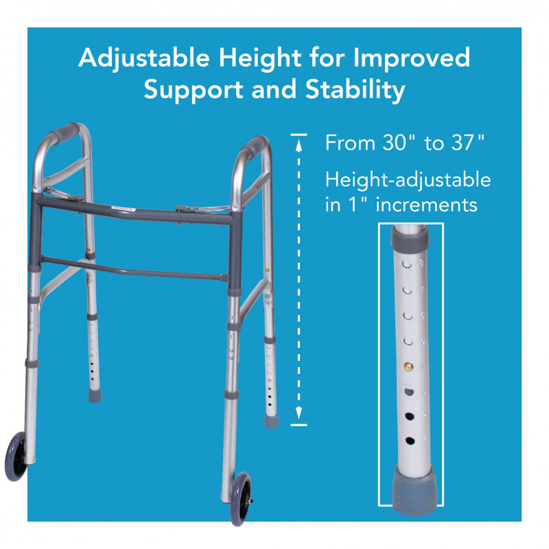 Stay mobile, active, and able with the Carex Folding Walker. The two-wheel walker offers a dependable source of support and assistance while walking. It is height adjustable from 30" to 37" for comfort and safety. Adjusting the portable walker is comfortable with marked peg holes for convenience. Take the compact walker anywhere by folding it for easy transport. Its sides are detachable for storing in tight spaces.