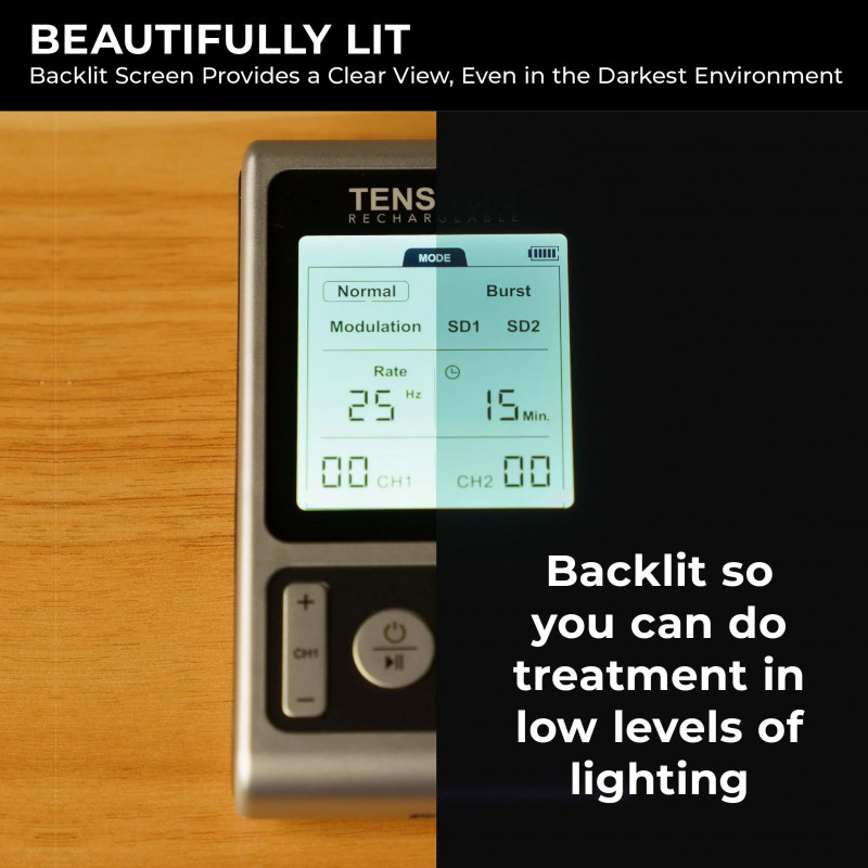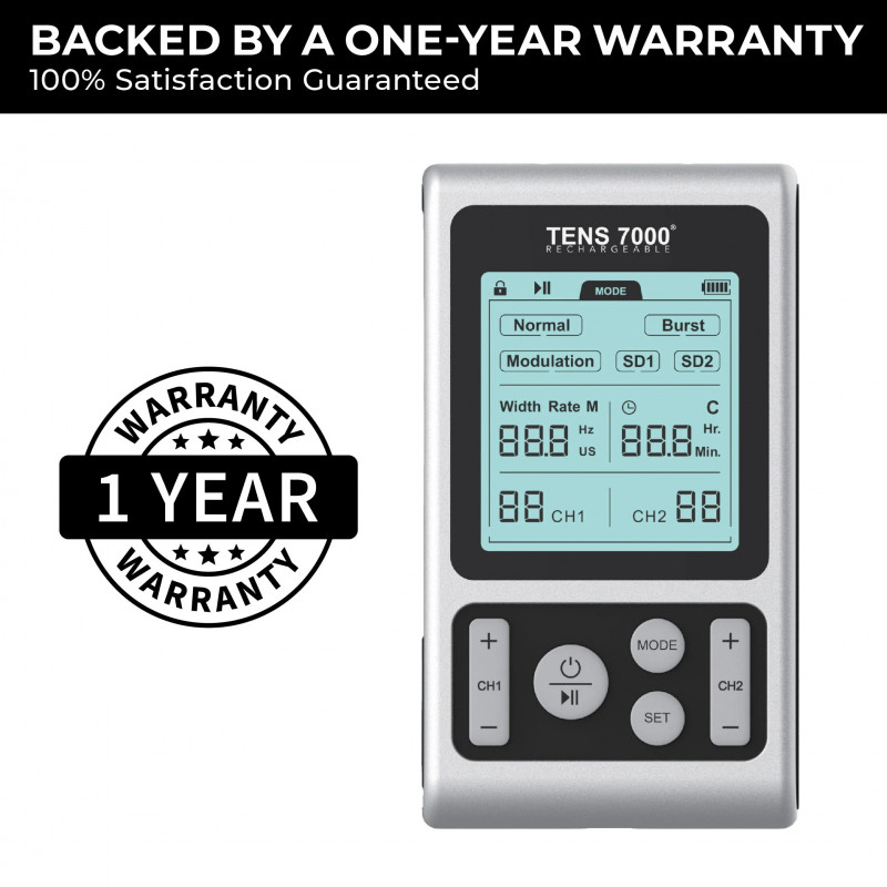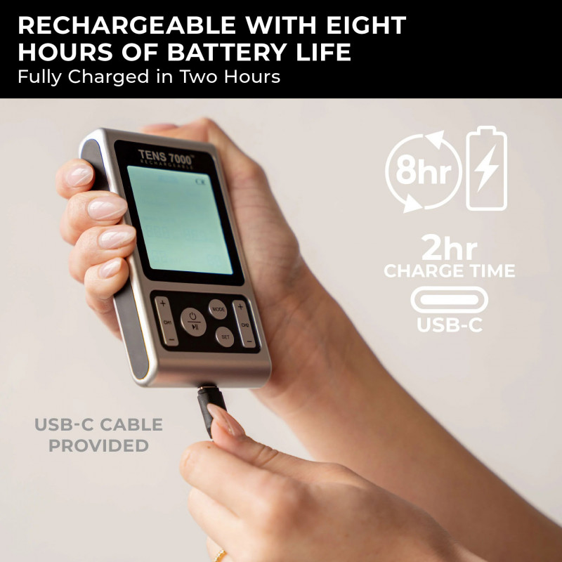The TENS 7000 Rechargeable electric stimulator machine is our upgraded version of the popular TENS 7000 2nd Edition. With an upgraded rechargeable battery providing up to eight hours of use and a backlit LCD, this powerful TENS unit offers the same pain relief as its predecessor (100 mA output) while adding convenience and visibility. Use our device to target chronic and acute back, neck, shoulder, and knee pain. Whether recovering from chronic pain or an injury, our TENS machine 7000 offers a safe, effective, and convenient way to manage pain and improve your quality of life.