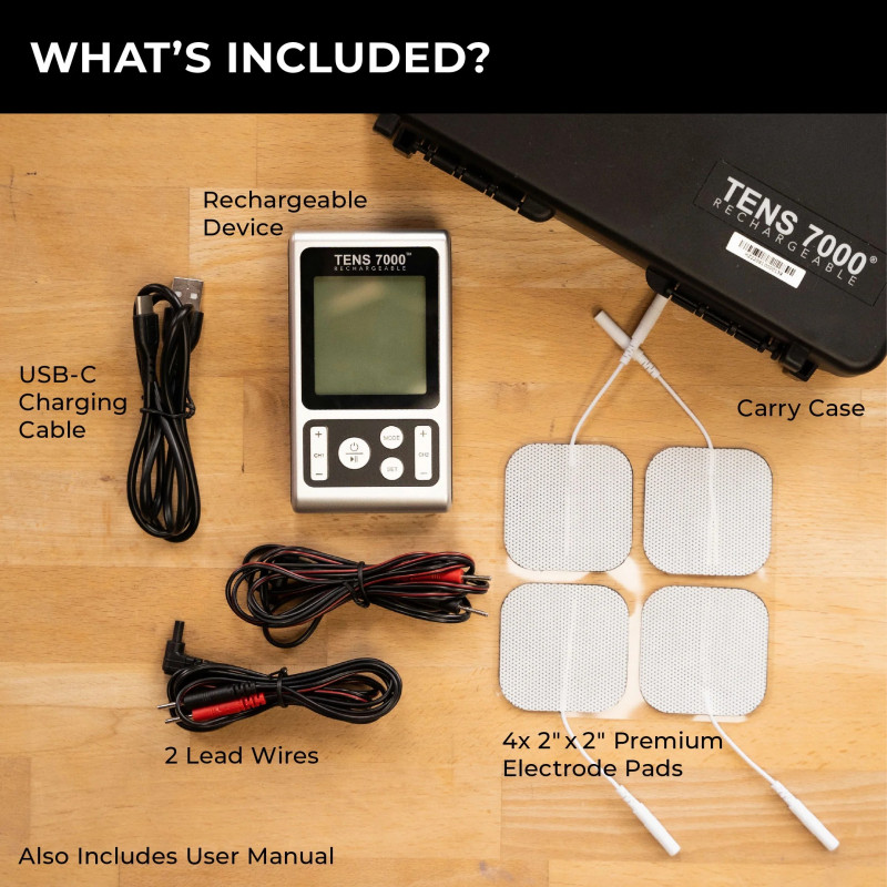 - Includes everything needed for TENS treatment. Order our complete kit and start your pain relief journey right away. It has everything needed, including the device, four electrodes, two lead wires, a USB-C charging wire, an instruction manual, and a carrying case for easy storage.