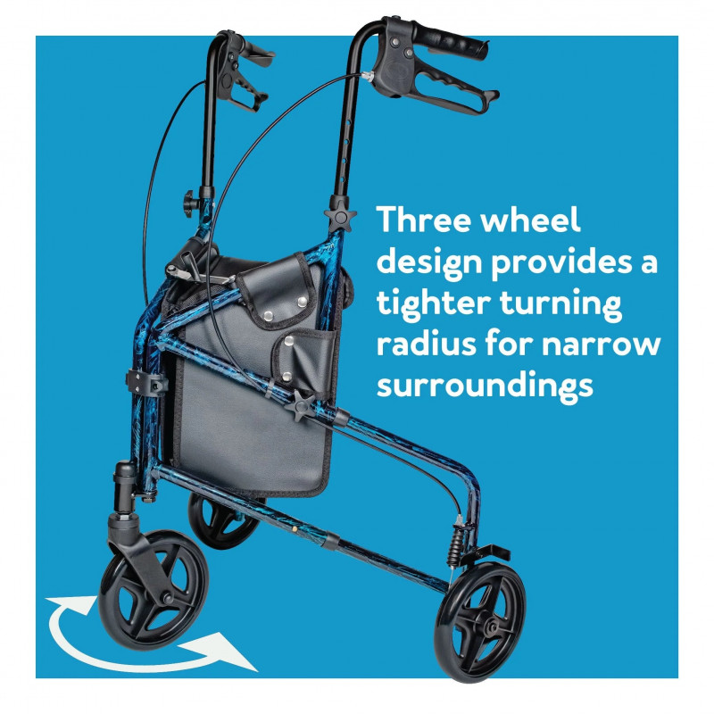 - Lightweight, three-wheeled walker easily maneuvers in tight spaces. The unique three-wheel design enables the folding walker to move around in tight spaces and make tight turns easily.