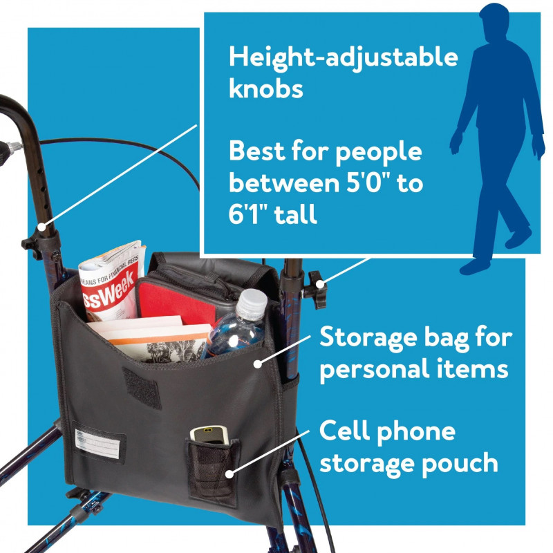 - Storage bag for personal items. Take your personal items with you by storing them in the mobility aids storage bag. Easily store your phone, books, purse, and more.