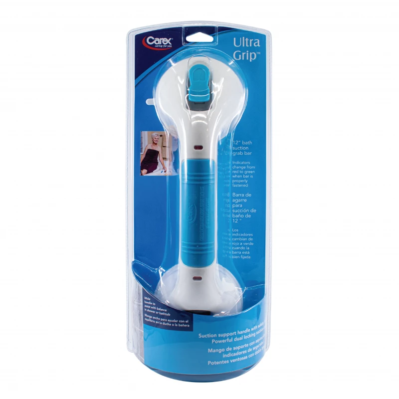 Stay independent and improve your bath safety with the Carex safety grab bar. The Ultra Grip Grab Bar assists users entering or leaving the bathtub or shower. Its strong suction grips hold tightly to any smooth, flat, and non-porous surface. The bathroom grab bar features a visual indicator that changes from red to green to show when the bar is properly secured into place. No installation is required. Available in 12" or 16".