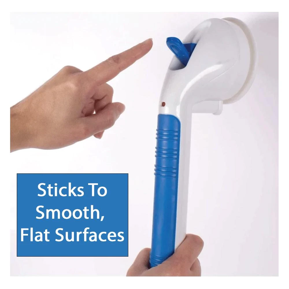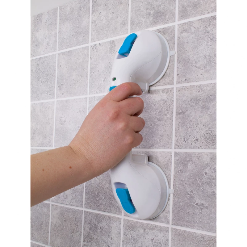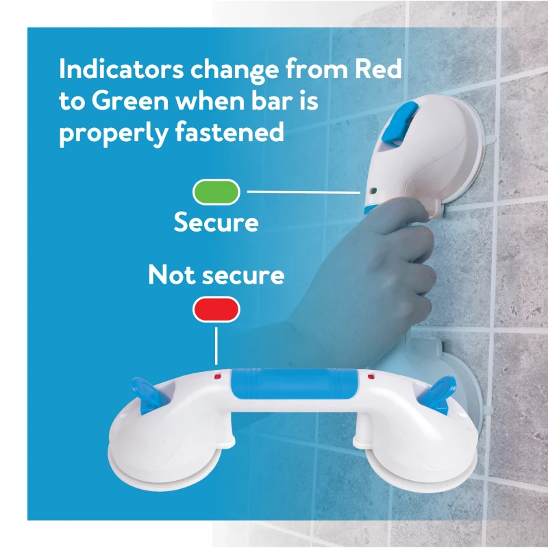 - Indicates when the bathtub safety bar is properly fastened. A significant drawback for most suction cup shower handles is not knowing when they're fastened. This can lead to injury. Our tub safety bar features indicators that change from red to green to show when it's properly fastened to the wall.