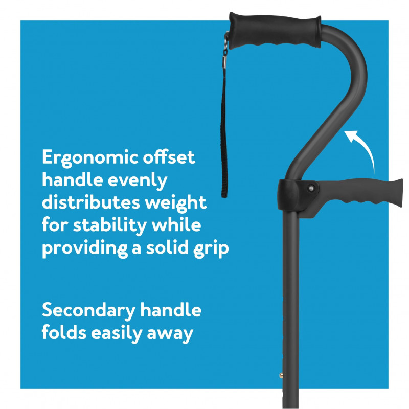 - Ergonomically designed for comfort. Both the primary and flip-down handle feature ergonomic grips shaped to match your hand. This design adds more grip and makes the cane comfortable to hold even if it's used for hours at a time.