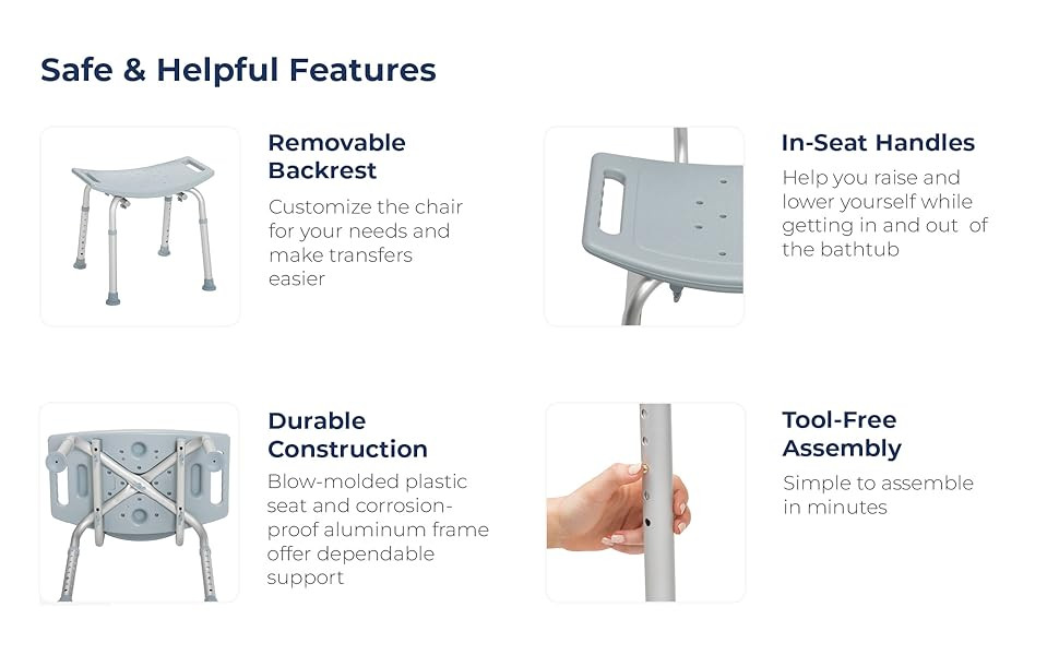 - Built-In Drainage & Handles: The seat includes drainage holes to prevent water buildup and in-seat handles for easy transfers in and out of the tub.
