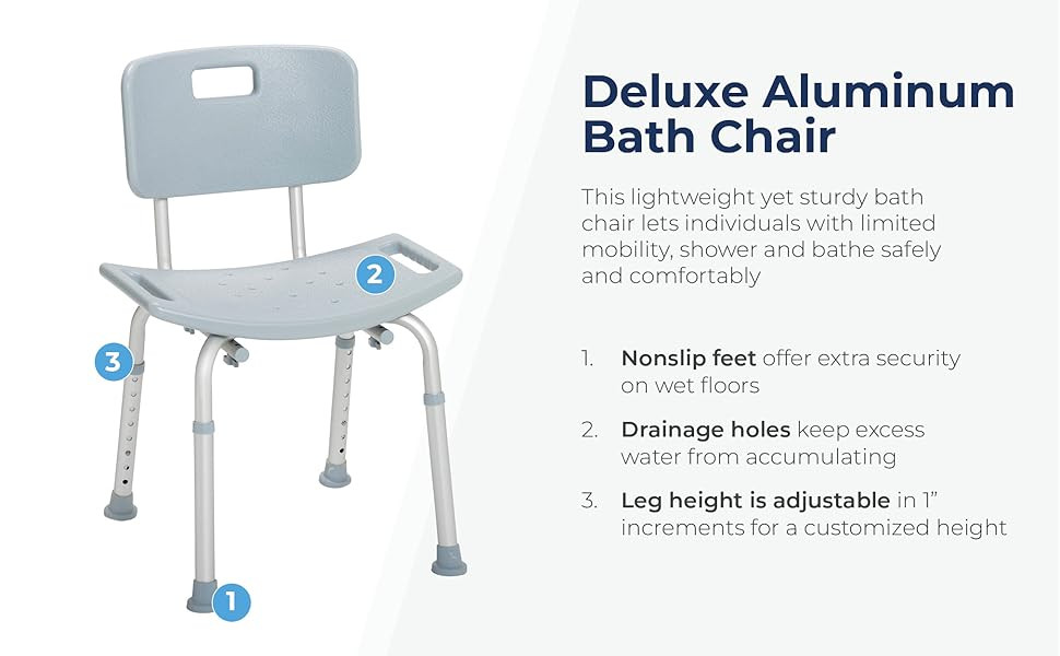 The ultimate shower chair for stability, comfort, and safety. The Drive Medical Deluxe Aluminum Bath Chair is designed for individuals with limited mobility to bathe with confidence. This lightweight yet sturdy chair features a corrosion-resistant frame, adjustable legs, and a contoured seat with built-in handles for added support. Bathing can now be relaxing and secure—without the risk of slipping or fatigue.